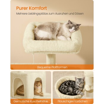 Ideal für Mehrkatzenhaushalte: 3 gemütliche Liegeplätze, eine kuschelige Höhle und ein weiches Körbchen – so findet jede Katze ihr eigenes Plätzchen zum Ausruhen, Zusammenrollen und Wohlfühlen auf diesem Kratzbaum