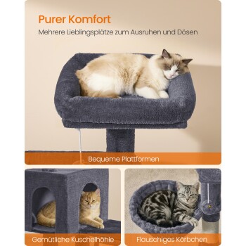 Ideal für Mehrkatzenhaushalte: 3 gemütliche Liegeplätze, eine kuschelige Höhle und ein weiches Körbchen – so findet jede Katze ihr eigenes Plätzchen zum Ausruhen, Zusammenrollen und Wohlfühlen auf diesem Kratzbaum