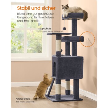 Robust und langlebig: Die 48 x 48 cm große, breite Basis und der Kippschutz sorgen für hervorragende Stabilität und Sicherheit. Dank der soliden Konstruktion trägt dieser Katzenbaum bis zu 60 kg – so kann Ihre Katze unbesorgt spielen und toben