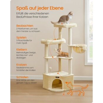 - Rundum-Spaß: Mit 3 Plüschbällen, einer Höhle, einer Liegemulde und 2 Plattformen wird es Ihren Katzen auf diesem Kratzbaum nie langweilig.