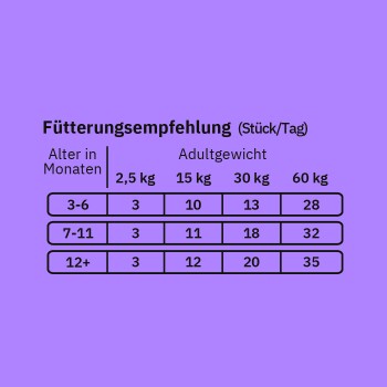 Dank der glutenfreien und hochverdaulichen Rezeptur sind die Darmwohl-Snacks auch ideal für Hunde mit empfindlichen Mägen. Ob als Belohnung zwischendurch oder als täglicher Snack, Darmwohl bringt Balance in den Bauch deines Hundes – für ein glückliches Bauchgefühl und mehr Freude im Alltag.