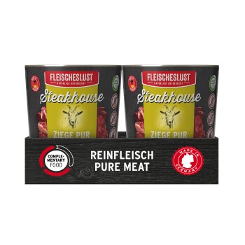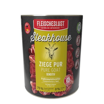 Dabei besteht die Sorte aus nur einem tierischen Protein mit 75 % hochwertigem Fleisch & Innereien von der Ziege.