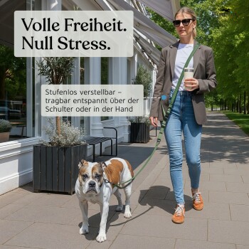 - STUFENLOS VERSTELLBARE UMHÄNGELEINE: Ob in der Stadt oder im Grünen, ob 1,60 m oder 2 m Körpergröße - die 3m Freihandleine lässt sich stufenlos einstellen. Tragbar entspannt über der Schulter oder auch klassisch in der Hand.