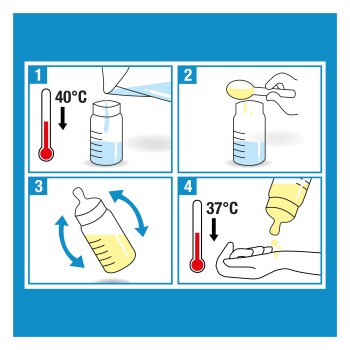 1. Frisches Trinkwasser abkochen, auf ca. 40°C abkühlen lassen und 2/3 des benötigten Wassers (s. Tabelle) in ein Fläschchen geben.