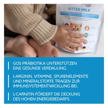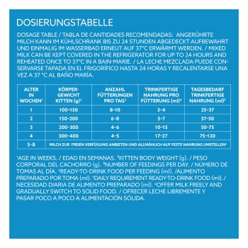 Bei Zubereitung Gebrauchsanweisung genau beachten. Anzahl der Mahlzeiten und Trinkmengen sind Richtwerte und können individuell nach Rasse, Alter und Gewicht variieren. Im Zweifel bitte einen Tierarzt konsultieren. Kitten täglich wiegen, um eine Gewichtszunahme und gute Entwicklung sicherzustellen.