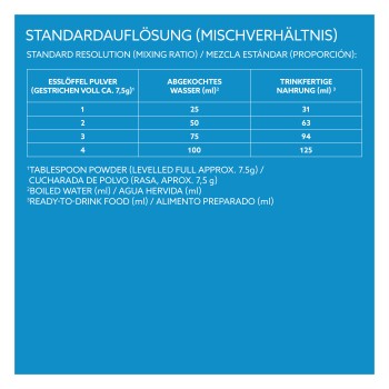 1 Esslöffel Pulver, gemischt mit 25 ml abgekochtem Wasser, ergibt 31 ml trinkfertige Nahrung.