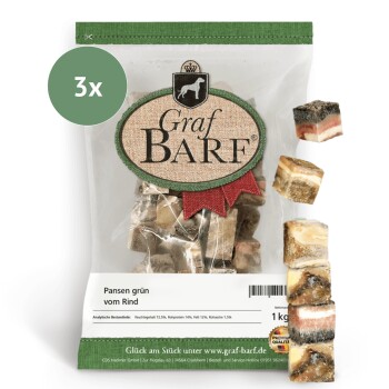 Mit wertvollen Grünstoffen ist der grüne Pansen vom Rind beim Barfen von höchster Bedeutung. Er stärkt nachhaltig das Immunsystem, liefert Vitamine und Mineralstoffe und unterstützt die gesunde Darmflora Ihres Hundes. Der Rinderpansen grün wird am Stück in große Blöcke gefroren und dann in Würfel geschnitten.