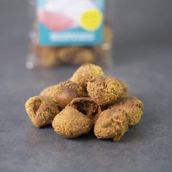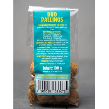 Green Hero Duo Pallinos sind hochwertige Hundesnacks mit einer besonderen Kombination aus herzhaftem Putenfleisch, cremigem Joghurt, süßer Aprikose und Honig. Die schonend gebackenen Bällchen sind besonders bekömmlich und eignen sich hervorragend als Belohnung für zwischendurch.