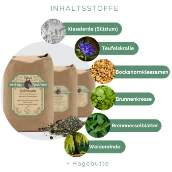 Pflanzliche Rezeptur: Silizium, Teufelskralle, Bockshornkleesamen, Brunnenkresse, Brennnesselblätter, Weidenrinde, Hagebutte