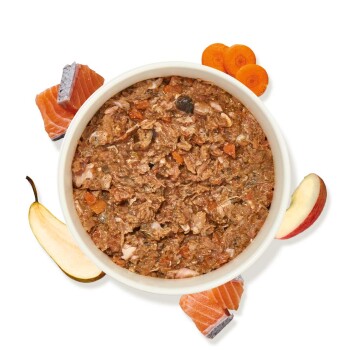BARF Komfort PLUS Lachs, 500 g: 81 % Lachs inkl. Gräten, 12 % Karotten, 4 % Äpfel, 2 % Birnen, 1 % haustierkost.de Pulver (Algenkalk, Bierhefe, Traubenkernmehl, Seealgenmehl, Brennnessel, Brombeerblätter, Löwenzahn, Kamille, Mariendistel)