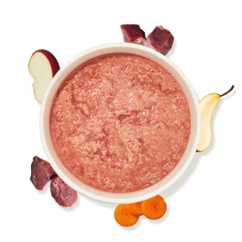 Für eine ausgewogene rohe Fütterung von ausgewachsenen und gesunden Hunden empfehlen wir eine Futterzusammenstellung aus 70 - 80 % tierischen und 20 - 30 % pflanzlichen Komponenten. Der tierische Anteil sollte hierbei aus 50 - 60 % Muskelfleisch, 20 % Pansen und Blättermagen, 10 - 15 % Innereien sowie 10 - 15 % rohen fleischige Knochen (RFK) bestehen. Der pflanzliche Anteil besteht idealerweise aus 70 - 75 % Gemüse und 25 - 30 % Obst. Ergänzend gehören Zusätze wie Lachs-Öl oder Omega-3-6-9 Öl sowie Seealgenmehl in den Napf.