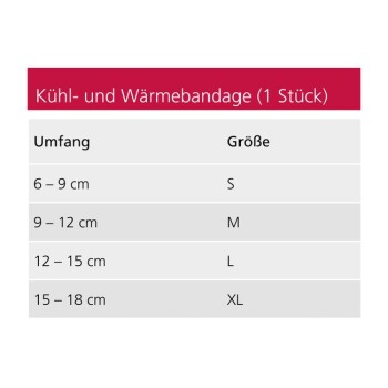 Die Kühl- und Wärmebandage ist in vier Größen erhältlich, die sich nach dem Umfang des zu behandelnden Körperteils richten (siehe Maßskizze Produktfotos).