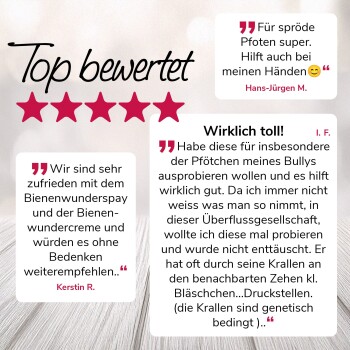 Trägt Ihr Hund einen Pfotenschuh oder eine Orthese? Pflegen Sie die Pfoten vor dem Anziehen mit der Bienenwundercreme – das hilft, Druckstellen zu verhindern und sorgt für ein gutes Hautklima.