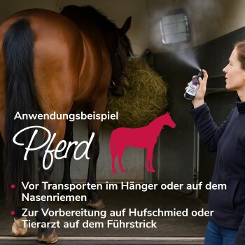 Versprühen Sie es zu Hause, in der Transportbox, im Auto oder Pferdehänger.