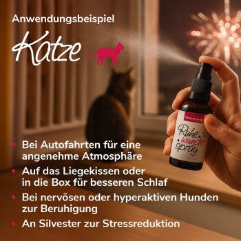 In besonderen Situationen – eine Feier mit vielen Gästen, an Silvester, oder wenn eine zweite Katze ins Haus kommt – können Sie das Ruhewunderspray versprühen.
