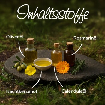 Olivenöl (Olea europaea fruit oil), Nachtkerzenöl (Oenothera biennis oil), Calendulaöl (Calendula officinalis flower oil), Rosmarinöl (Rosmarinus officinalis leaf oil), Zitronenöl (Citrus limon peel oil), Weihrauchöl (Boswellia carterii oil)