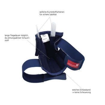 - Lege die Bandage von hinten mit der Auswölbung an die Ferse und verschließe die Klettverschlüsse mit einem angenehmen Zug. Zur Gewöhnung an die Bandage kannst du auch zunächst die Schienen entfernen und dann nach einer gewissen Zeit wieder einsetzen. Vorne sollte sie ein wenig überlappen...
