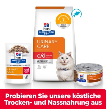 Hill's™ Prescription Diet™ c/d™ Katzenfutter Urinary Stress ist eine Nahrung, die klinisch erwiesen ein erneutes Auftreten von Symptomen einer FIC (idiopathische Blasenentzündung der Katze) reduziert. L-Tryptophan & Milchproteinhydrolysat mindern Stress, einem bekannten Risikofaktor für FIC. Omega-3-Fettsäuren (EPA & DHA) helfen, den Entzündungszyklus zu unterbrechen. Magnesium, Phosphor und Calcium reduzieren die Konzentration von Struvitsteinen (Magnesium und Phosphat) und Calciumoxalatbestandteilen im Urin. Natrium hilft, eine gesunde Nierenfunktion zu erhalten. Citrat bildet lösliche Komplexe mit Calcium zur Reduktion der Calciumoxalatbildung. Ziel ist es (Urin pH), die Bildung und Zusammenlagerung von Struvitkristallen zu erschweren, ohne die Bildung von Oxalakristallen anzuregen. Wasser erhöht das Urinvolumen, um eine Verdünnung der Harnsteinbestandteile zu erreichen. Vitamin E und Beta-Carotin helfen, freie Radikale zu neutralisieren, was zur Bekämpfung von Urolithiasis beiträgt. Vitamin C ist Wegbereiter für Oxalate.
