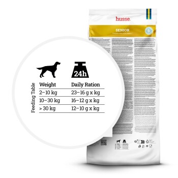 - Husse Senior ist eine vollwertige und ausgewogene Rezeptur für Hunde ab 7 Jahren