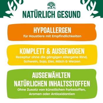 - Hypoallergen für Haustiere mit Empfindlichkeiten. Ohne die Allergene Rind, Schwein, Soja, Eier, Milch & Weizen. Ohne Zusatz von künstlichen Farbstoffen, Aromen, Antioxidantien.