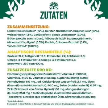 JAMES WELLBELOVED hat bei seinem Hunde Trockenfutter für ausgewachsene Hunde (Adult) eine Handvoll nahrhafter Zutaten mit schmackhaftem Lamm kombiniert, um leicht verdauliches, schmackhaftes Hundefutter herzustellen. Die Rezepte enthalten Zutaten, die die Verdauung, das Immunsystem und eine gesunde Haut und ein gesundes Fell unterstützen. Und das Beste daran: Du kannst sicher sein, dass dein Hund eine ausgewogene Ernährung mit dem Trockenfutter genießt. Eine, die nicht nur gut schmeckt, sondern ihm auch gut tut.