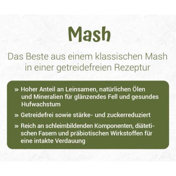 - Hoher Anteil an Leinsamen, natürlichen Ölen und Mineralien für glänzendes Fell und gesundes Hufwachstum