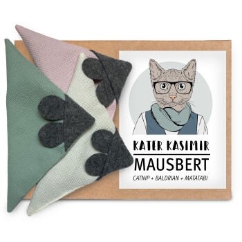 Kater Kasimir 3 x Mausbert - Die 2-in-1 Spielmaus für Katzen, handgemacht aus BIO-Baumwolle mit Katzenminze-, Baldrian- und Matatabi-Füllung