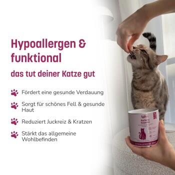 - Hypoallergener Snack aus gefriergetrockneten Zutaten in Lebensmittelqualität für sensible Katzen