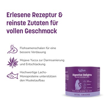 Digestive Delights fördern eine gesunde Verdauung und stärken die Darmflora – für weniger Beschwerden, mehr Energie und eine entspannte Katze.