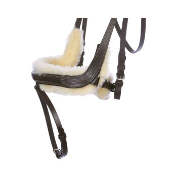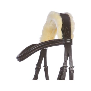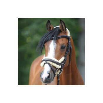 <p>Diese englisch-kombinierte Trense glänzt mit ihrem gebogenen Schnitt und dem abnehmbaren Lammfellpolster, das Druckstellen vorbeugt und gleichzeitig für eine schicke Optik sorgt. Das breite, anatomisch geformte Genickstück bietet optimale Ohrenfreiheit, während das Lammfell durch Klettverschlüsse leicht abnehmbar und waschbar ist. Die weiche Polsterung an Nasenriemen und Genickstück schmiegt sich angenehm an, und die Kontrastnähte sowie das gebogene Stirnband runden das edle Design ab.</p>