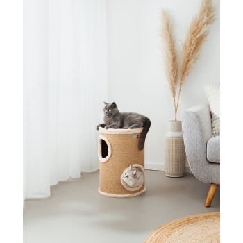 Entdecken Sie unsere robuste und vielseitige Kratztonne, die perfekt in jedes Zuhause passt. Mit ihrer rundum robusten Juteoberfläche bietet die Tonne optimale Bedingungen für die Krallenpflege, zum Klettern und Spielen. Die obere weiche Plattform dient als kuscheliger Rückzugsort, während 2 bis 3 plüschgefasste Eingänge das natürliche Spiel- und Jagdverhalten Ihrer Katze fördern. Ein integrierter Spielball sorgt für zusätzlichen Spaß.