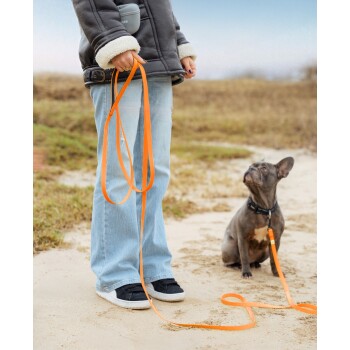 Die ergonomisch gepolsterte Neopren-Handschlaufe liegt angenehm in der Hand und bietet auch bei längeren Trainingseinheiten optimalen Komfort. Ein drehbarer 360°-Karabiner verhindert ein Verdrehen der Leine und ermöglicht eine flexible Befestigung am Halsband oder Geschirr. Dank der leichten Ausführung eignet sich die Leine besonders gut für kleine und mittelgroße Hunde. Sie wird inklusive einer atmungsaktiven Mesh-Tasche geliefert, in der sie sauber aufbewahrt und transportiert werden kann. Die Leine ist in zwei Farben und vier Längen zwischen 5?m und 20?m erhältlich – passend für verschiedene Trainingssituationen.