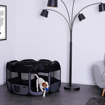 Durch das Pop-up-System erfolgt der Aufbau kinderleicht, der faltbare Hundelaufstall ist zusammenklappbar und wird mit einer praktischen Tragetasche geliefert.