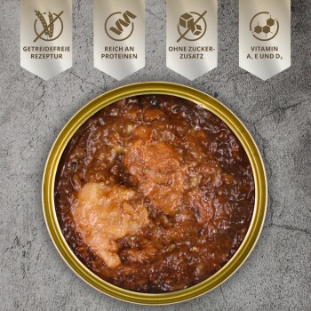 Unser köstliches 100% Nassfutter wird aufgrund der schmackhaften Zutaten nicht nur von anspruchsvollen Gaumen geschätzt, sondern liefert auch wichtige Proteine sowie diverse Mineralstoffe und Vitamine.