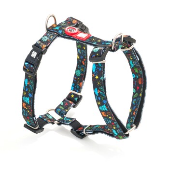 Unsere H-Geschirre bestehen aus einer robusten Polyester-Oberseite mit einzigartigen Designs und einer weichen, schnell trocknenden und anschmiegsamen Neopren-Unterseite. Durch diese Materialauswahl sind die H-Geschirre ultraleicht und besonders angenehm zu tragen – deine Fellnase wird kaum merken, dass sie ein Geschirr trägt.