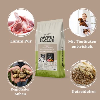 MyPetClub Lamm getreidefreies Trockenfutter ohne Weizen oder Zucker, sensitiv, monoprotein