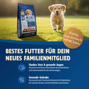 - M!EAT von NutriQM ist das Trockenfutter für Hunde mit dem Tierwohl-Siegel.