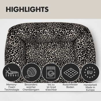 Das Hundebett LEONIE vereint orthopädische Gesundheitsvorsorge mit stilvollem Design. Umhüllt von einem hochwertigen Jacquardstoff in moderner Leooptik wird dieses Hundebett zum eleganten Blickfang – und gleichzeitig zum neuen Lieblingsplatz deines Hundes.