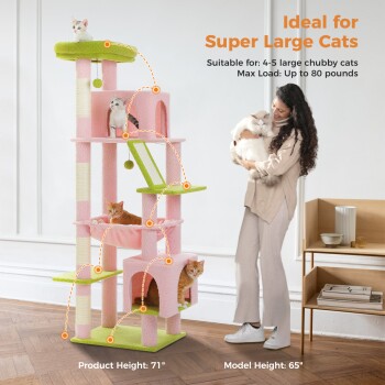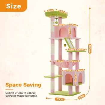 Wenn Ihre Maine Coon oder Ragdoll neue Abenteuer sucht, bietet dieser 180 cm hohe Kratzbaum genau das Richtige. Die extragroße Hängematte (55,7 x 45,7 cm) lädt zum Dösen ein, während vier sisalumwickelte Stämme zum Kratzen einladen. Zwei geräumige Häuschen bieten Rückzugsorte für ruhige Momente.