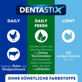 - 30% weniger Kalorien pro Stick im Vergleich zu DENTASTIX™ Daily Oral Care mit dem gleichen großartigen Geschmack