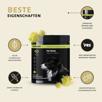 petDog Health 2603 ist ein speziell entwickeltes Ergänzungsfuttermittel für Hunde ab dem mittleren Lebensalter. Die Kombination aus hochwertigen, natürlichen Nährstoffen unterstützt auf ernährungsphysiologische Weise die Mobilität, Aktivität und das allgemeine Wohlbefinden älterer Hunde – Tag für Tag.