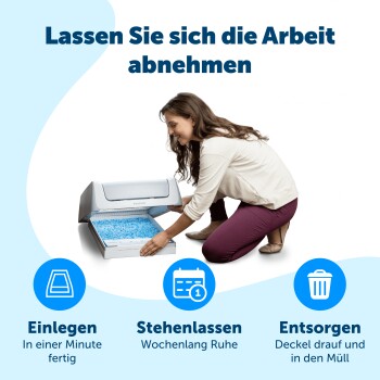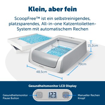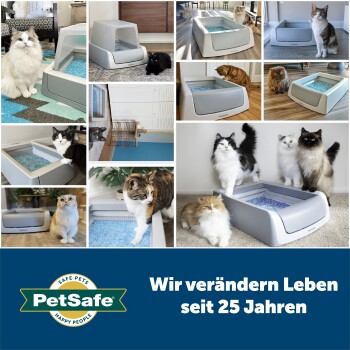 Streichen Sie das tägliche Reinigen der Katzentoilette von Ihrer To-do-Liste. Mit der Selbstreinigende Katzentoilette ScoopFree® mit Haube haben Sie wochenlang eine saubere und gepflegte Katzentoilette. Die spezielle Silikat-Katzenstreu bindet Gerüche bis zu fünfmal besser als herkömmliche, klumpende Katzenstreu, da sie den Urin sofort absorbiert und Kot schnell trocknet. Auch Ihre Böden bleiben sauberer, da die Katzenstreu zu 99 % staubfrei ist und nicht an den Pfoten haften bleibt. Sicherheitssensoren sorgen dafür, dass der Rechenzyklus nur ausgeführt wird, während sich keine Katze auf der Toilette befindet. Die Einwegschalen haben eine Kunststoffauskleidung als Auslaufschutz sowie einen Deckel zur schnellen und einfachen Entsorgung. Die gebrauchte Schale lässt sich bequem durch eine neue austauschen. Ein Gesundheitsmonitor zählt die Besuche der Katzentoilette. Dadurch lassen sich gesundheitliche Probleme gegebenenfalls frühzeitig erkennen. Die mitgelieferte Haube bietet Ihrer Katze einen angenehmen Sichtschutz. Mit der Marke PetSafe® können Sie und Ihr Haustier zusammen glücklich leben™.