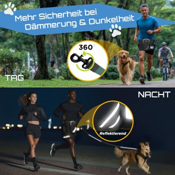 - 3-in-1 Hände-frei System mit verstellbarem Bauchgurt, reflektierendem Hundehalsband und robuster Leine für maximale Bewegungsfreiheit und Kontrolle.