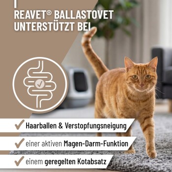 REAVET BallastoVET Cat bringt sanfte Unterstützung in den Alltag Deiner Katze. Die ausgewogene Ballaststoff-Formel ergänzt die tägliche Fütterung mit wertvollen Ballaststoffen und unterstützt bei Neigung zu festem Kot sowie bei vermehrter Haaraufnahme die normale Darmfunktion.