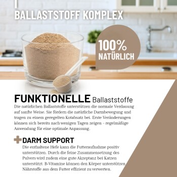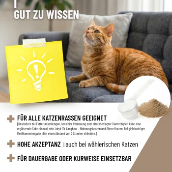 Gerade Wohnungskatzen, Langhaarkatzen und Katzen im Fellwechsel profitieren von der funktionalen Ergänzung, da verschluckte Haare ernährungsphysiologisch begleitet und besser ausgeschieden werden können. Die enthaltenen löslichen Ballaststoffe tragen zu einer normalen Kotkonsistenz bei und unterstützen die natürliche Darmbewegung. Das hohe Quellvermögen der Flohsamenschalen fördert ein erhöhtes Stuhlvolumen und eine angepasste Feuchtigkeit des Darminhalts. Die fein gemahlene Pulverform lässt sich einfach unter das Futter mischen und wird in der Regel gut akzeptiert. Dank der guten Verträglichkeit eignet sich BallastoVET für Katzen aller Rassen – auch für sensible Feinschmecker.