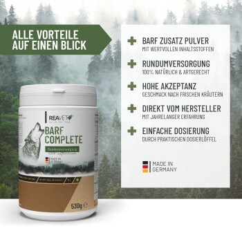 REAVET BARF Complete ist ein optimaler, rein natürlicher BARF Zusatz für Hunde aller Rassen. Mit wichtigen Mineralstoffen und Vitaminen wird Dein Hund rundum versorgt und so der Nährstoffbedarf auf natürliche Weise gedeckt. Unsere BARF Mineralien für Hunde werden einfach als Futterergänzung über die tägliche Mahlzeit gegeben. So kannst Du Deinen Hund barfen und dabei Mangelerscheinungen vorbeugen. Diese Komposition an feinen Zutaten ist sowohl für ältere als auch Junghunde ab dem 9. Monat geeignet.