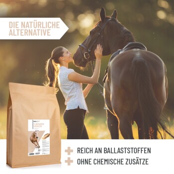 *Die Flohsamenschalen stets vor dem Füttern mit heißem Wasser ca. 30 Minuten quellen lassen und dem Feuchtfutter bzw. in gut eingeweichten Heucobs oder Mash untermischen. Hinweis: Die Flohsamenschalen bitte stets einweichen und ausreichend Wasser zur Verfügung stellen.