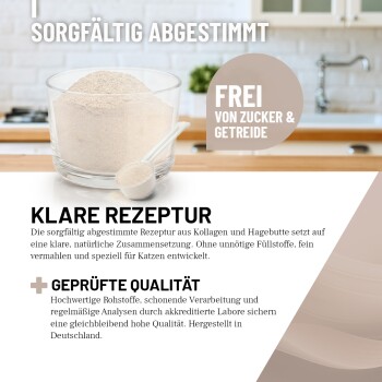 Die klar abgestimmte 2-Komponenten-Rezeptur kombiniert: hochwertiges Kollagen und natürliches Hagebuttenpulver. Das enthaltene Kollagen liefert wertvolle Strukturproteine für den Bewegungsapparat. Ideal für Katzen aller Rassen und Altersstufen – vom aktiven Abenteurer bis zum entspannten Stubentiger im besten Alter. Eine ausgewogene Ergänzung kann insbesondere bei erhöhter Gelenkbelastung, altersbedingter Beanspruchung oder gesteigerter Aktivität sinnvoll sein.
