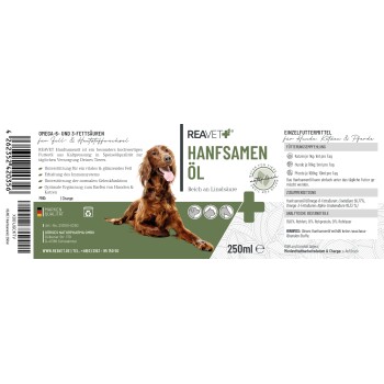 REAVET Hanfsamenöl ist ein hochwertiges Futteröl, das aus sorgfältig ausgewählten Hanfsamen der Sorte Cannabis Sativa aus kontrolliertem Anbau kaltgepresst wird. Durch die besonders schonende Verarbeitung bleibt das natürliche Verhältnis von Omega-6- (Linolsäure) zu Omega-3-Fettsäuren (Alpha-Linolensäure) von 3:1 erhalten.