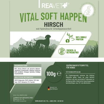 Ohne Getreide, Zuckerzusatz oder künstliche Farb- und Aromastoffe. Stattdessen bieten wir Deinem Hund ein hochwertiges Leckerli mit einem besonders hohen Anteil an tierischem Protein. Unsere REAVET Vital Soft Happen erhältst Du im praktischen, wiederverschließbaren 100g-Aromabeutel – ideal auch für unterwegs.